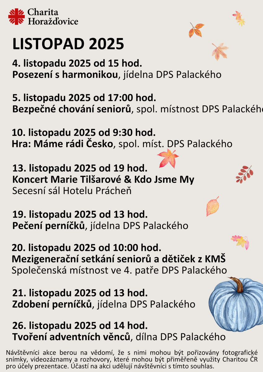 Návštěvníci akce berou na vědomí, že s nimi mohou být pořizovány fotografické snímky, videozáznamy a rozhovory v rámci dokumentace akce, které mohou být přiměřeně využity Charitou ČR pro účely prezentace a s pořizováním takových záznamů souhlasí. Účastí na akci udělují návštěvníci souhlas se zpracováním poskytnutých osobních údajů podle zákona č. 101/2000 Sb. Souhlas se zpracováním osobních údajů udělují dobrovolně a mohou jej kdykoli odvolat.