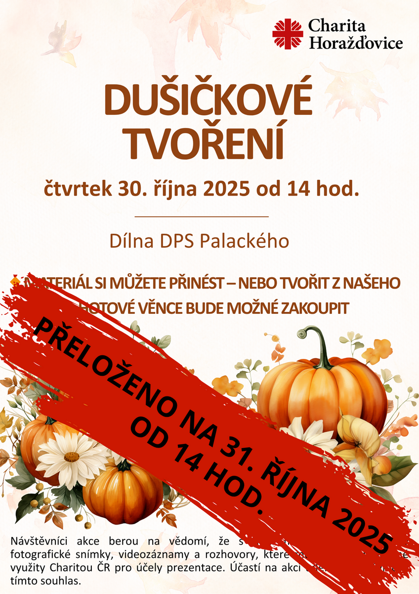 Návštěvníci akce berou na vědomí, že s nimi mohou být pořizovány fotografické snímky, videozáznamy a rozhovory v rámci dokumentace akce, které mohou být přiměřeně využity Charitou ČR pro účely prezentace a s pořizováním takových záznamů souhlasí. Účastí na akci udělují návštěvníci souhlas se zpracováním poskytnutých osobních údajů podle zákona č. 101/2000 Sb. Souhlas se zpracováním osobních údajů udělují dobrovolně a mohou jej kdykoli odvolat.