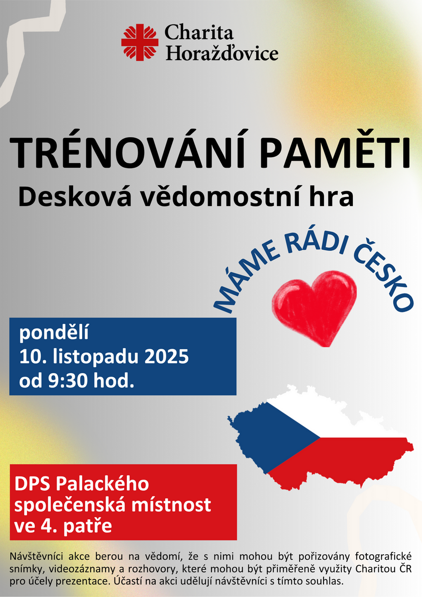 Návštěvníci akce berou na vědomí, že s nimi mohou být pořizovány fotografické snímky, videozáznamy a rozhovory v rámci dokumentace akce, které mohou být přiměřeně využity Charitou ČR pro účely prezentace a s pořizováním takových záznamů souhlasí. Účastí na akci udělují návštěvníci souhlas se zpracováním poskytnutých osobních údajů podle zákona č. 101/2000 Sb. Souhlas se zpracováním osobních údajů udělují dobrovolně a mohou jej kdykoli odvolat.