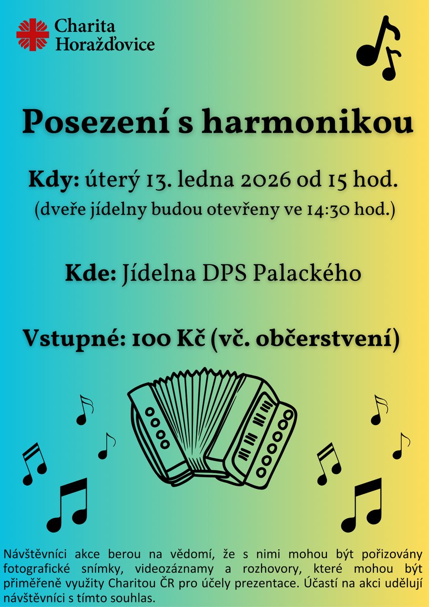 Návštěvníci akce berou na vědomí, že s nimi mohou být pořizovány fotografické snímky, videozáznamy a rozhovory v rámci dokumentace akce, které mohou být přiměřeně využity Charitou ČR pro účely prezentace a s pořizováním takových záznamů souhlasí. Účastí na akci udělují návštěvníci souhlas se zpracováním poskytnutých osobních údajů podle zákona č. 101/2000 Sb. Souhlas se zpracováním osobních údajů udělují dobrovolně a mohou jej kdykoli odvolat.